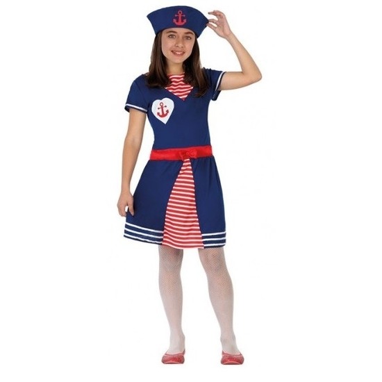 Matrozen verkleed jurkje voor meisjes. Dit voordelige verkleedkostuum bestaat uit een matrozenjurkje en een matrozen pet. Exclusief overige accessoires. Materiaal: polyester.