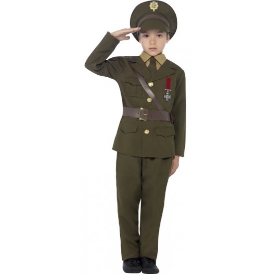 Leger officier kostuum voor kinderen. Een compleet leger officier carnavalkostuum voor kinderen. Deze outfit bestaat uit de hoed, de broek en het jasje met aangehecht het shirt, de stropdas en de riem. Kleur: army groen. Uit de tijd van de tweede wereldoorlog.
