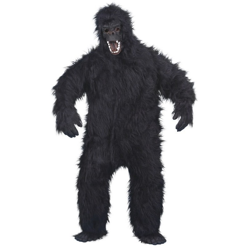 Gorilla apen kostuum in het zwart voor volwassenen, bestaande uit een pak, een masker, handen en voeten. One size fits most. Materiaal: polyester. Wasvoorschrift: enkel handwas. Borstomvang: 112 cm. Binnenbeenlengte: 84 cm. Lengte t/m 185 cm. Maat t/m maat 42.