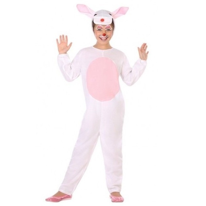 Dierenpak konijn/haas voor kinderen. Voordelig konijnenkostuum bestaande uit een wit met roze jumpsuit (onesie) met klittenbandsluiting aan de achterzijde en een losse muts met oren, ogen en de snoet. Materiaal: 100% polyester.