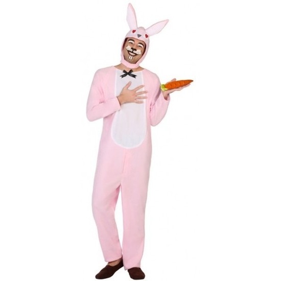 Roze dierenpak verkleed kostuum paashaas/konijn voor volwassenen. Dit kostuum in de kleur roze bestaat uit een jumpsuit/onesie en een losse capuchon met konijnenoren. Materiaal: 100% polyester.