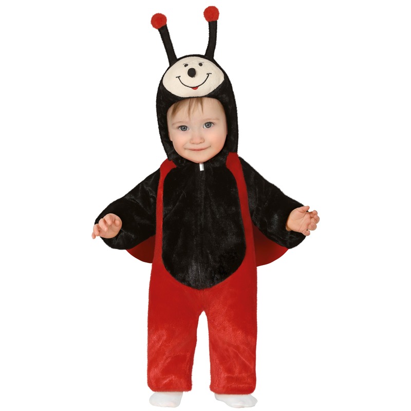 Dierenpak lieveheersbeestje voor peuters van 12 tot 18 maanden. Deze peuter lieveheersbeestjes jumpsuit/onesie is gemaakt van pluche. Materiaal: polyester. Brandvertragend. Peuterkostuums dierenpakken verkleed onesies.