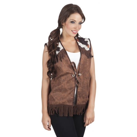 Bruin Cowboy vest voor vrouwen. Maat: one size fits all. Past tot maat L. Leuke accessoire voor uw cowgirl verkleedkleding set. Vergeet ook de accessoires niet.