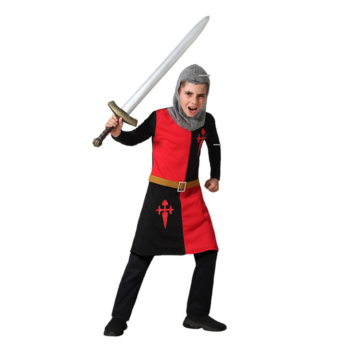Middeleeuwse ridder kostuum voor kinderen in de kleuren zwart/rood voor kinderen. Dit Middeleeuwse kruistocht ridder kostuum voor kinderen bestaan uit een lang overshirt of jurk en een zilveren kap. Exclusief zwaard en laarzen. Materiaal: 100 % polyester. Het kostuum is ideaal voor carnaval, themafeesten, of verkleedpartijtjes. Met een authentiek ontwerp, uitgevoerd in een klassieke rood-zwarte kleurcombinatie, brengt het de sfeer van middeleeuwse helden tot leven.