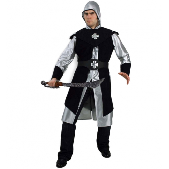 Zwarte ridder kostuum voor heren. Dit luxe kostuum bestaat uit een lange zwart met zilveren top met capuchon en wordt inclusief riem geleverd.
