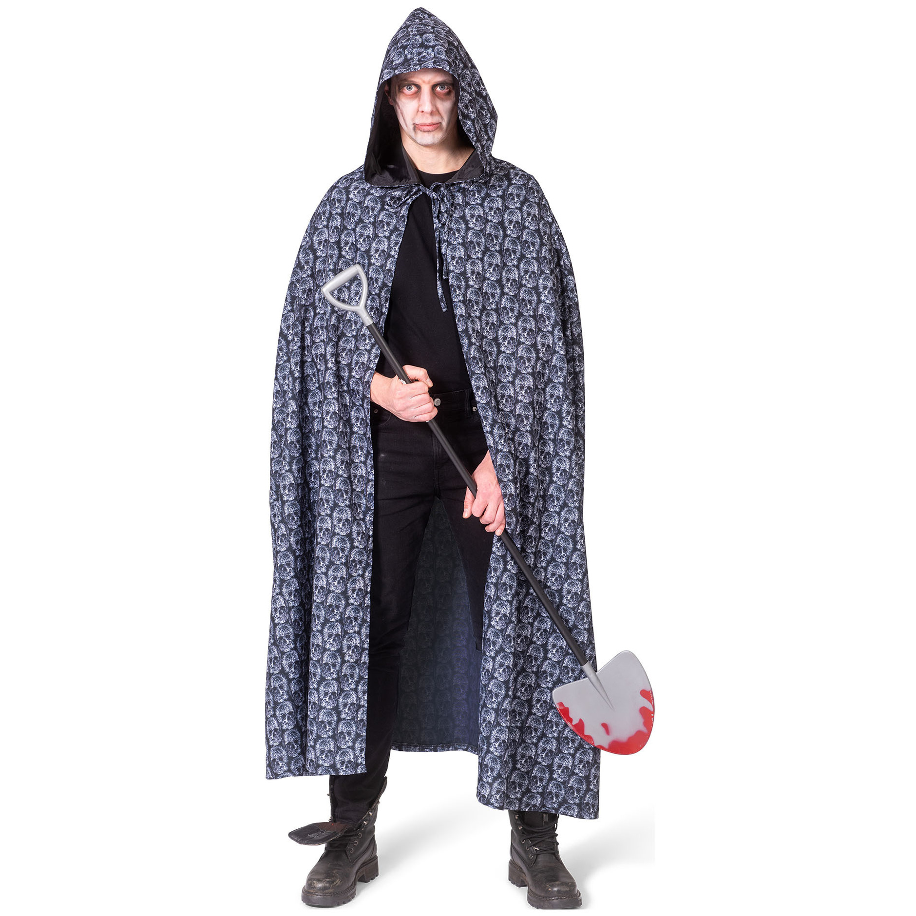 Verkleed cape met kap en schedels print. Gemaakt van zwarte polyester stof voor dames en heren. One size model. Carnaval kostuum/kleding. Vergeet ook de verkleed accessoires niet. Verkleedkleding mantels en capes. Ga verkleed als vampier, geest, middeleeuws persoon etc.