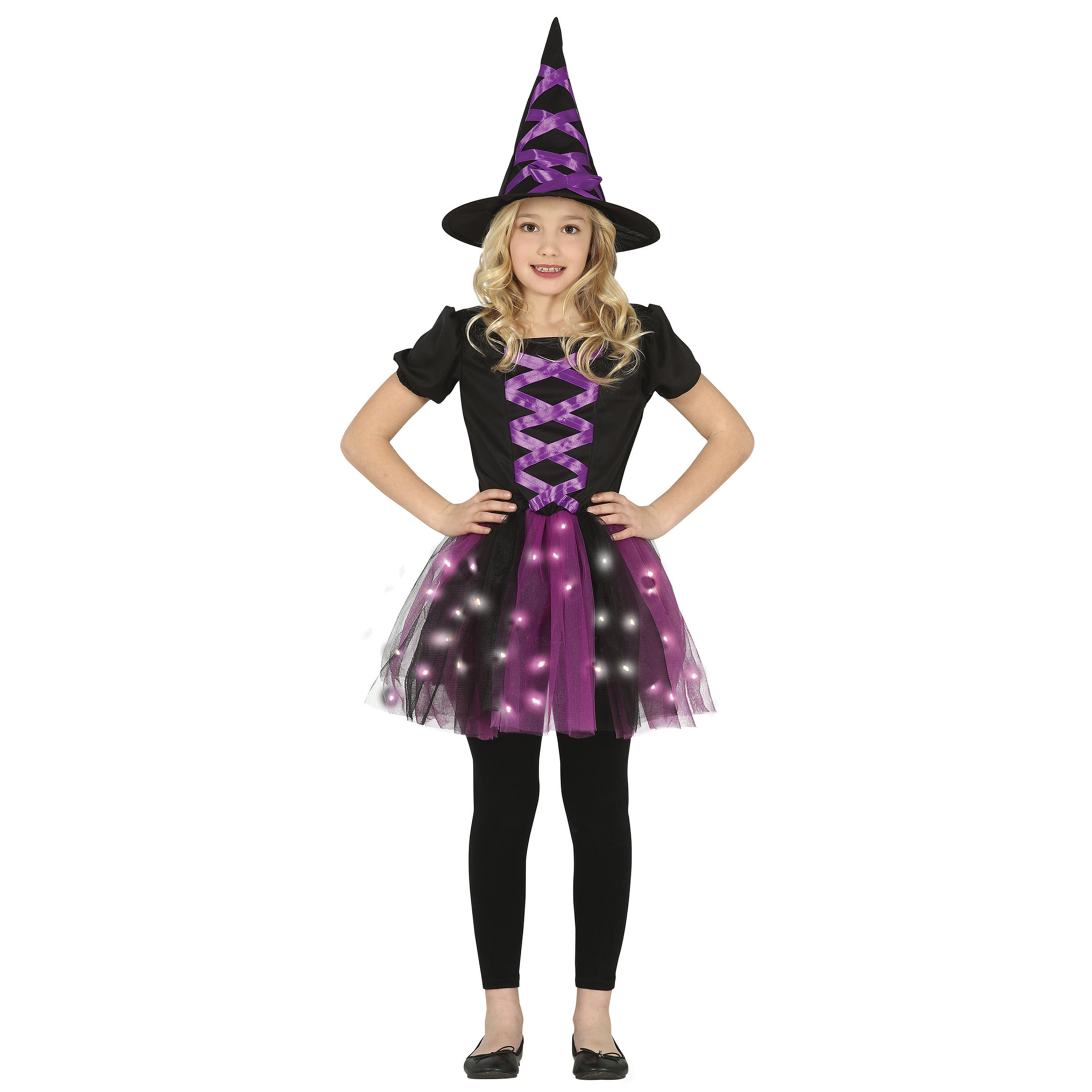 Heksen kostuum met LED verlichting. Transformeer je kleine tovenaarsleerling in een magische heks met dit prachtige 2-delige verkleed kostuum! Dit kostuum in stijlvolle zwart-paarse tinten is een echte blikvanger, ideaal voor Halloween, verkleedfeestjes, carnaval of een griezelige avond. Het opvallende design wordt nog magischer dankzij de LED-verlichting in de tule rok, die een betoverende gloed toevoegt aan elke stap. De set bestaat uit een jurk en een hoed.