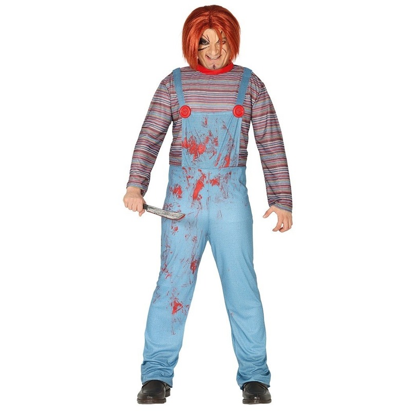 Horror pop Chuck verkleed kostuum voor heren. Dit Halloween poppen verkleedkostuum bestaat uit een jumpsuit met de opdruk van een shirt en tuinbroek. Wordt geleverd exclusief accessoires. Materiaal: 100% polyester. Chucky look-a-like verkleedoutfit.