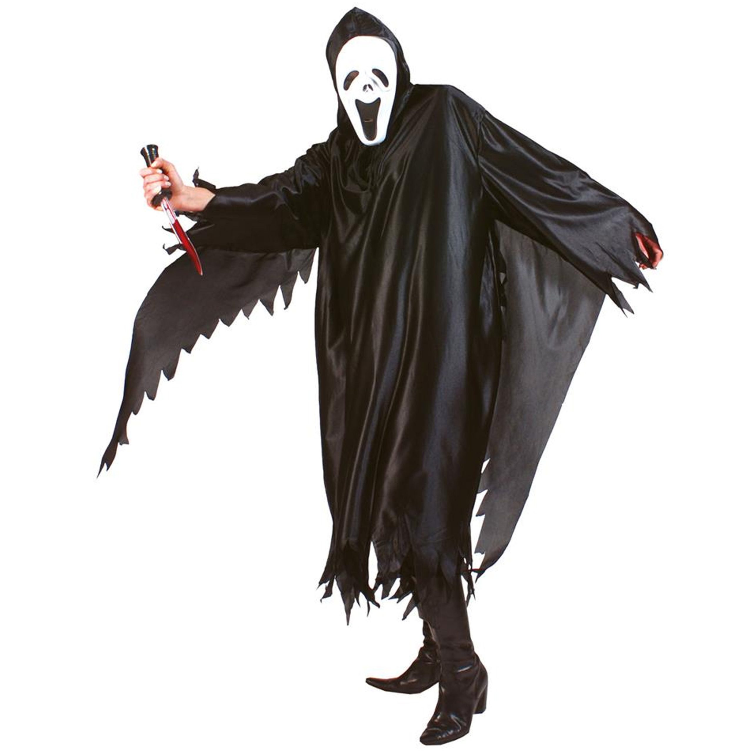 Zwart Scream cape met kap volwassenen voor over het hoofd in de kleur zwart. Gemaakt van polyester stof voor volwassenen. One size model. Carnaval kostuum/kleding. Vergeet ook de verkleed accessoires niet. Verkleedkleding mantels en capes. Ga verkleed als geest, spook, demoon, monster, killer, etc.