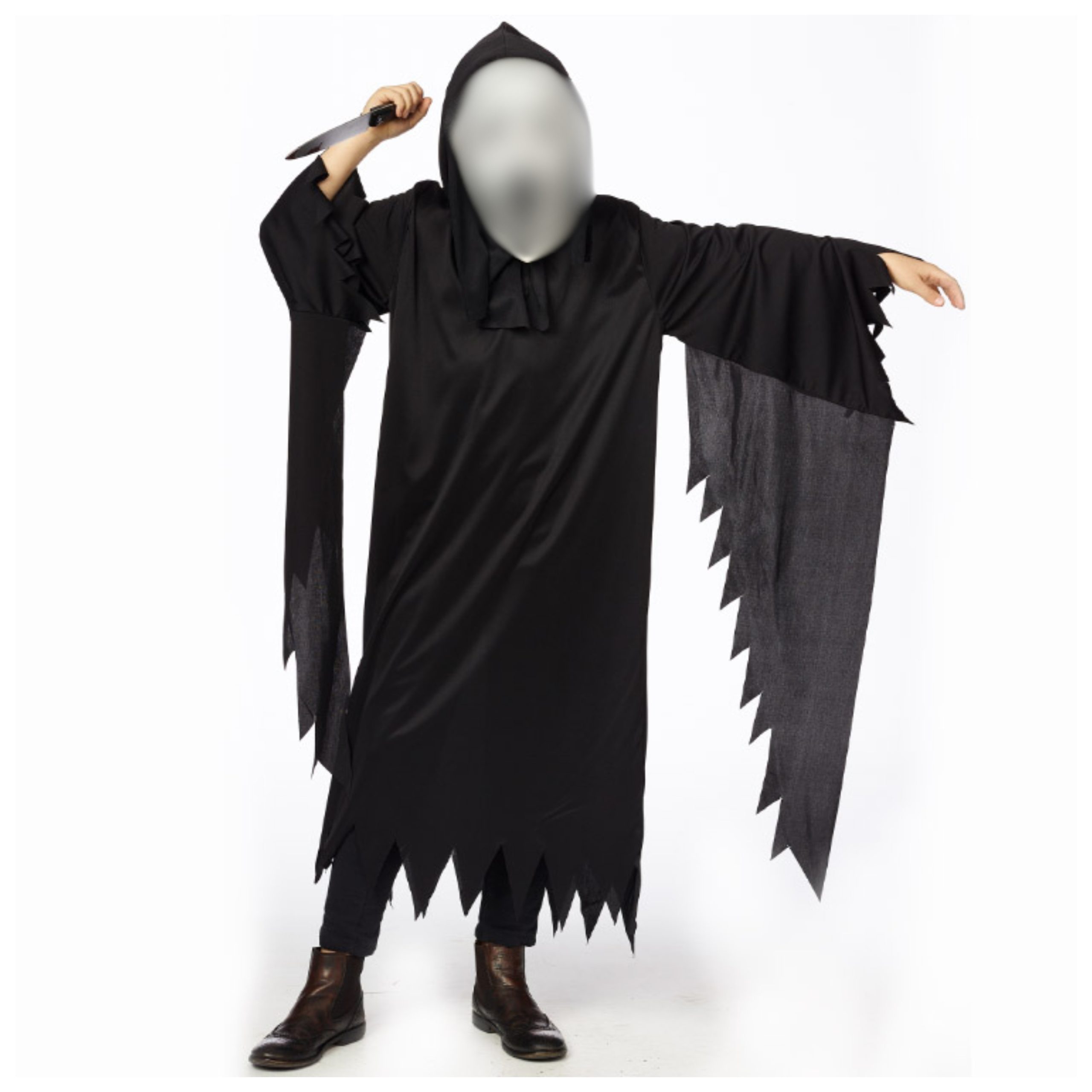 Zwart Scream kleding voor kinderen. Zwart kostuum bestaande uit een gewaad met gerafelde mouwen en een capuchon. U kunt het geheel over uw kleding dragen. Let op: Overige accessoires, zoals broek, masker en mes, niet inbegrepen! Materiaal: 100% polyester. Wasvoorschrift: handwas. Pasvorm: iets ruim vallend. Voordelige horror/Halloween verkleedoutfit voor jongens/meisjes. Jaren 90/90s/nineties party thema skelet moordenaars kostuum, bekend van de Scream en Scary Movie filmreeks films.