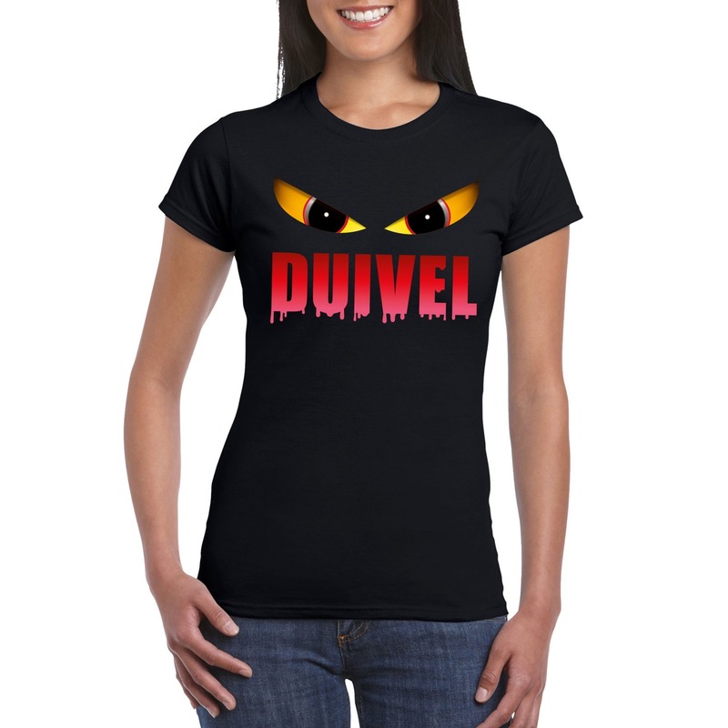 Halloween Duivel ogen t-shirt zwart dames. Op dit zwarte Halloween shirt staan twee griezelige ogen en de tekst duivel afgebeeld. Ook geschikt om de rode duivels te supporten tijdens een EK of WK. Materiaal: 150 grams, 100% katoen.