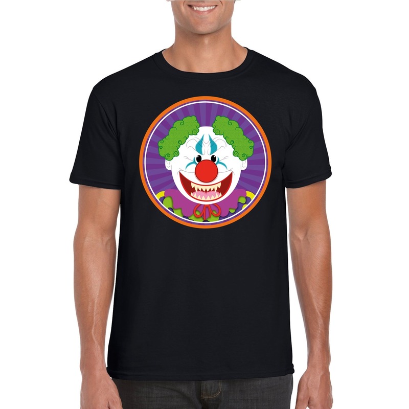 Halloween Horror clown t-shirt zwart heren. Op dit zwarte Halloween shirt staat een enge clown met scherpe tanden afgebeeld. Materiaal: 150 grams, 100% katoen.