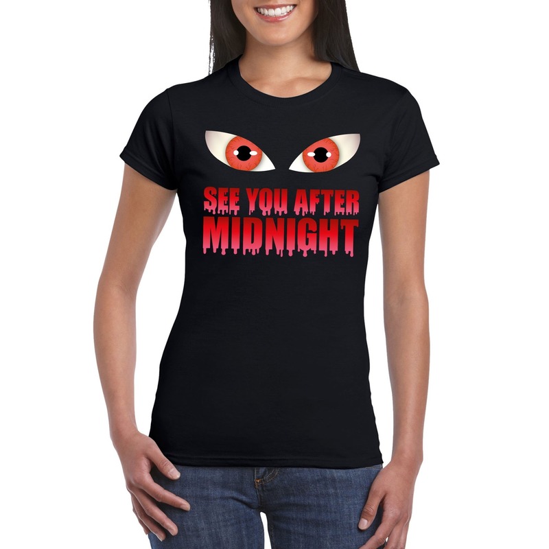 See you after midnight vampier t-shirt zwart dames. Op dit zwarte Halloween shirt staan twee enge ogen afgebeeld met daaronder de tekst See you after midnight. Materiaal: 150 grams, 100% katoen.