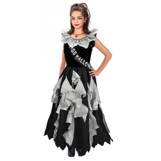 Prom Queen zombie kostuum voor meisjes. Grijs met zwarte prom dress voor meisjes met een sjerp waarop staat Miss Halloween. De zombie meiden jurk is in verschillende maten verkrijgbaar. In deze verkleed jurk is ieder kind de ster van het Halloween feest!