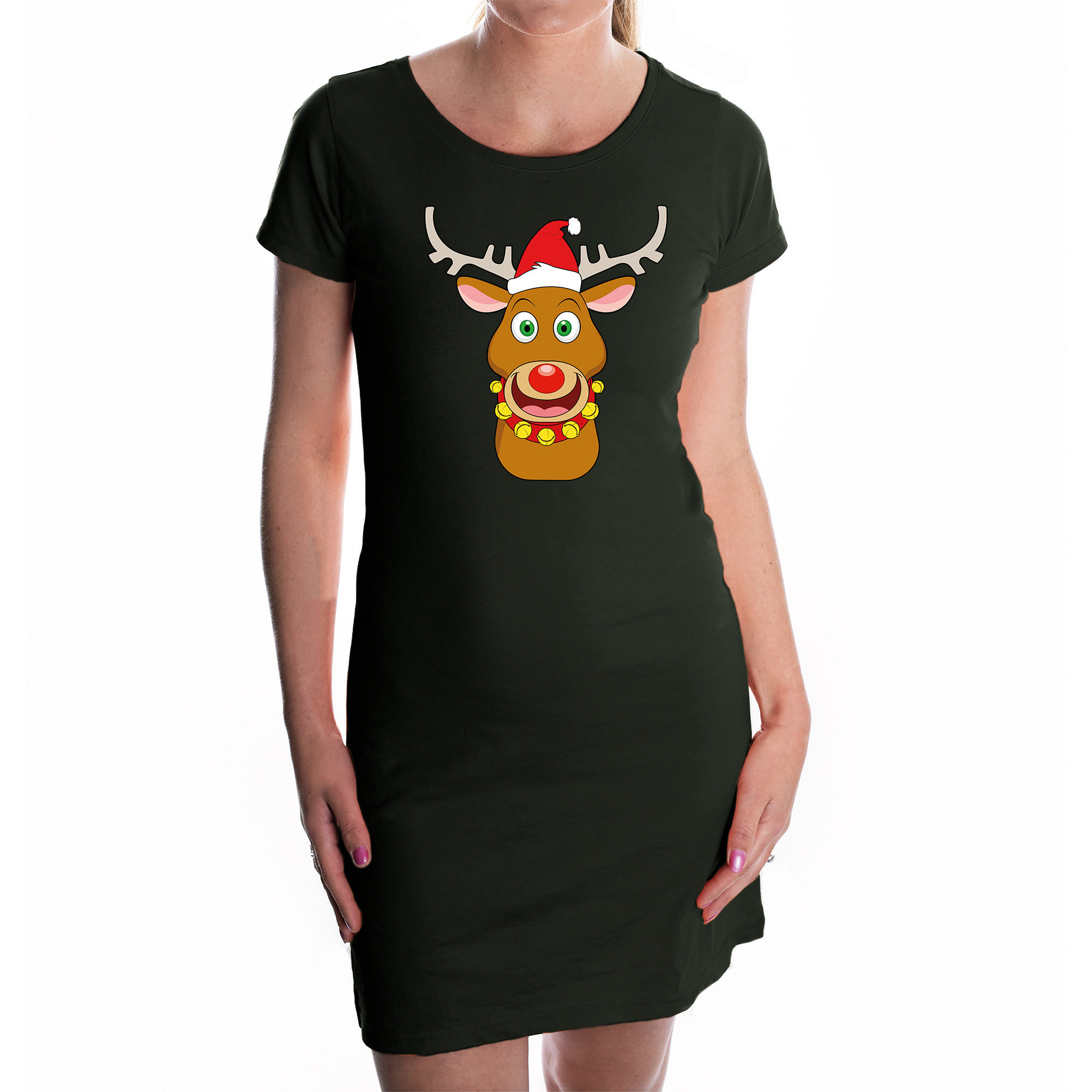 Fout rudolf het rendier kerst jurkje zwart voor dames. Dit zwarte kerst jurkje is bedrukt met rudolf het rendier met een rode kerstmuts. Het jurkje is licht getailleerd en heeft een laag uitgesneden ronde hals met kapmouwen. Leuke foute jurk om aan te trekken met de Kerstdagen, of om te geven als Kerstcadeau voor onder de boom.Materiaal: 100% katoen, 180 grams.