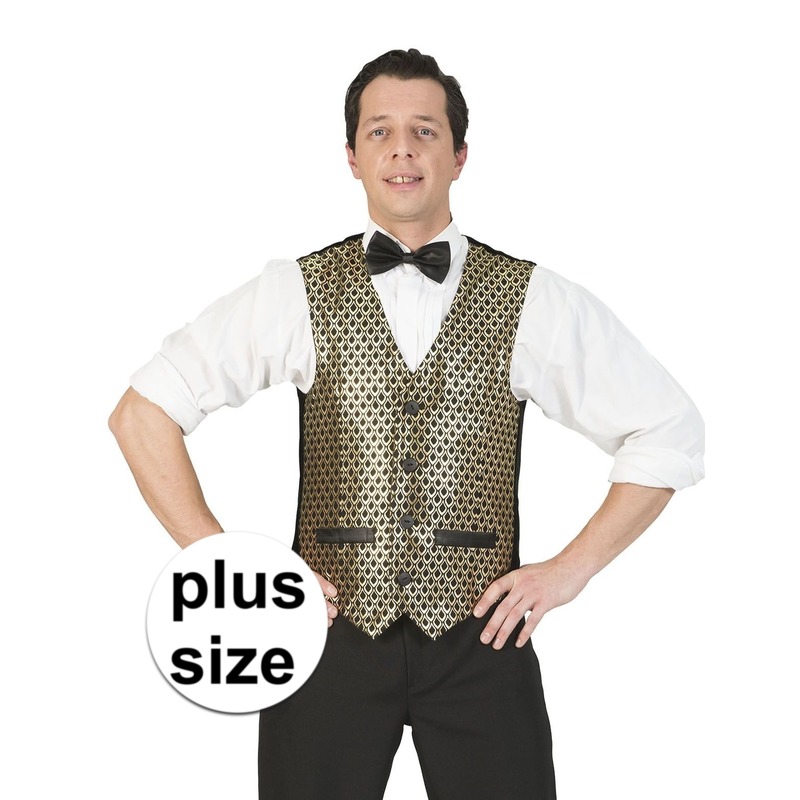 Een grote maat goud/zwart gilet, geschikt voor heren. Materiaal: polyester. Dit carnaval verkleed accessoire heeft aan de achterkant een gesp om de gilet strakker aan te trekken. Wasvoorschrift: Enkel handwas, niet geschikt voor in de droger en niet strijken.
